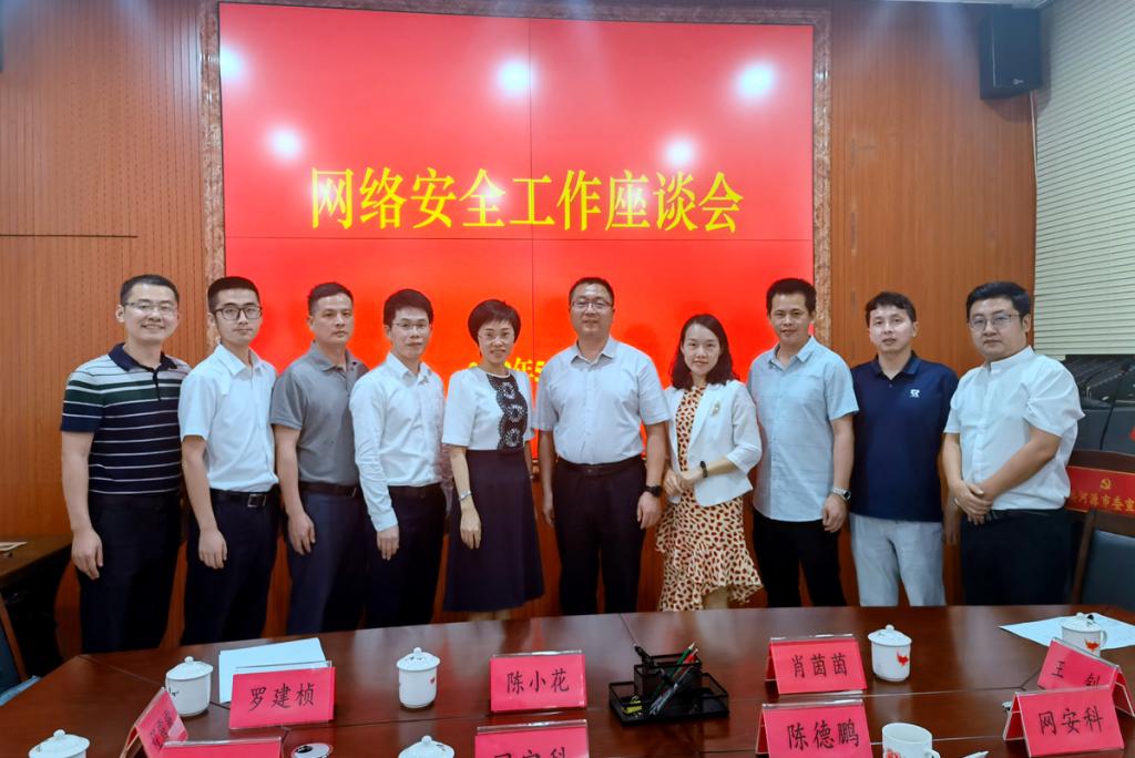 在交流会上,陈德鹏首先对公司领导及相关教师的到来表示欢迎,并介绍了河源市委网信办的基本架构和主要功能,随后陈小花对陈德鹏的接待表示感谢,也对公司成立至今的发展情况进行了介绍。之后,双方就网络安全相关人才的市场需求和培养模式,以及网络舆情应急管理、信息系统安全防范等方面的就业机会、人才培训、科研合作开展了深入讨论。