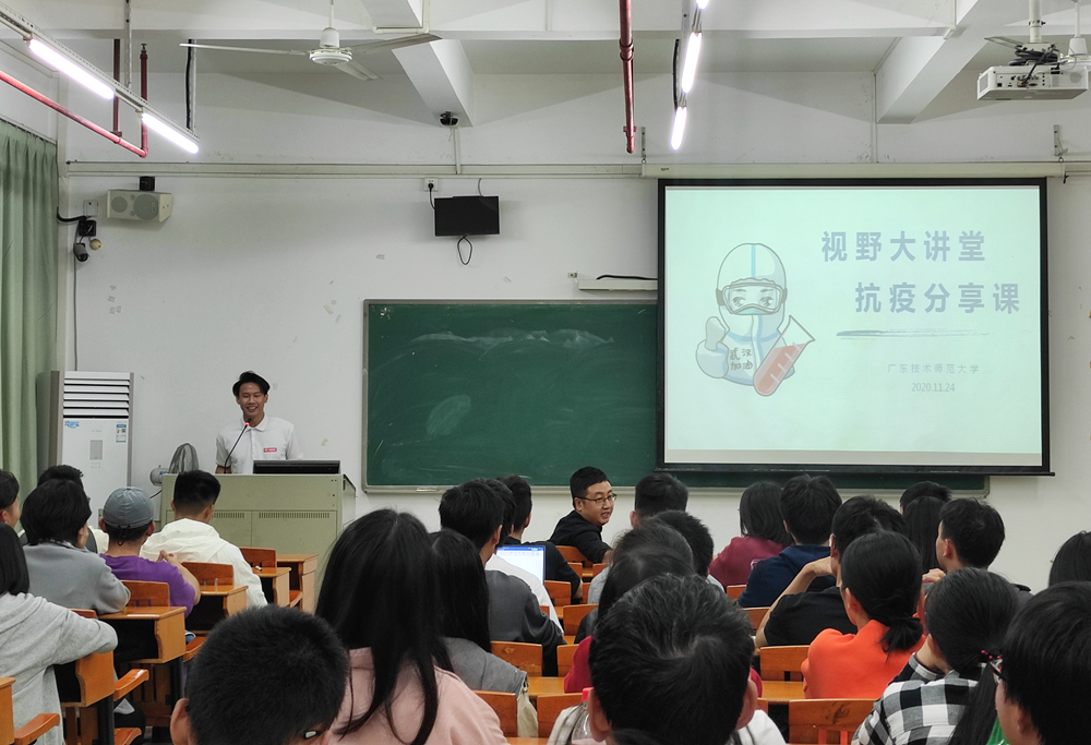 陈国豪讲述了他支援湖北疫情防控的点点滴滴。从起初对疫情严重性的认识不到位,到接到出征通知后的忐忑,最后在家人的支持与鼓励下,毅然在除夕夜集结出征赶往湖北,支援当时的疫情重灾区武汉汉口医院。因为是第一批支援队,他们的工作条件十分艰苦,每天上下班都是步行;轮到夜班时,晚餐都是冷饭冷菜。面对医护工作者及后勤人员人手的严重不足,他们不仅要做好本职的医护工作,还身兼多职,送餐、病房清洁、舒缓病人情绪……哪里有需要他们就出现在哪里。终于,经过近两个月的奋战,在党中央的坚强领导下,在全体医护工作者通力合作下,在社会各界人士的爱心帮扶下,疫情得到有效控制。令人感动的是,在回到广州的专机上他们又见到了出征时的机组人员,机长哽咽的讲到“58天前我们送你们出征,今天我们接英雄们回家”。讲座的最后,陈国豪以“学以致用,不负韶华,做新时代有为青年”与全体同学互勉。