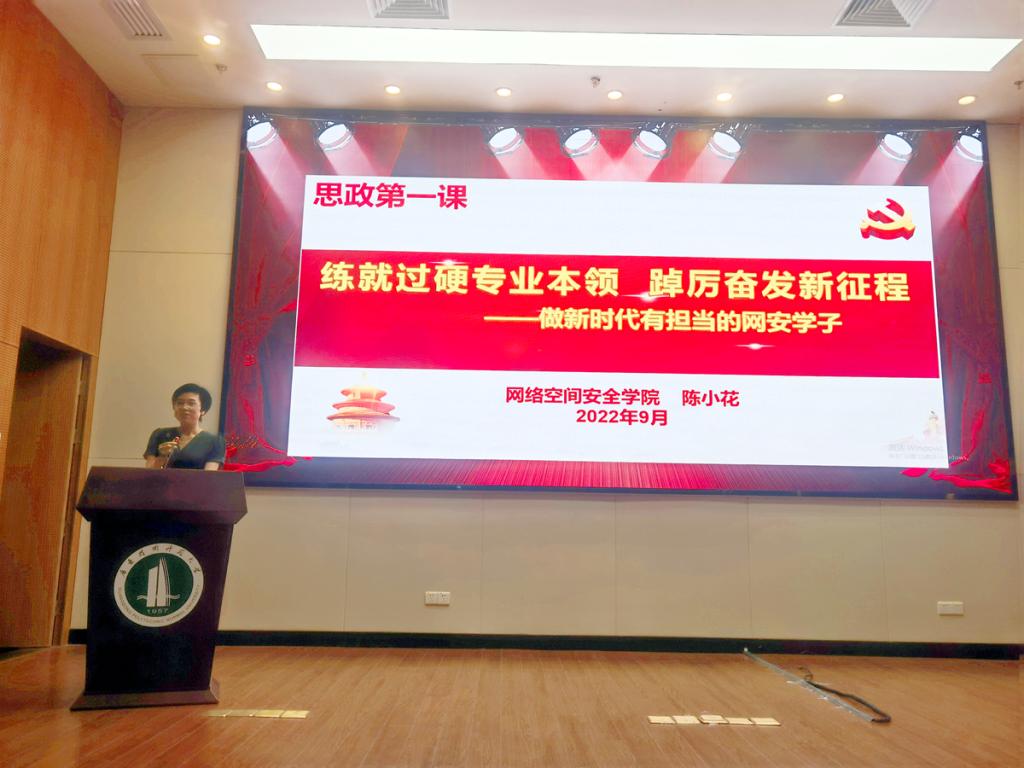 陈小花代表公司对公司2022级本科新生表示热烈欢迎,并以《练就过硬专业本领,踔厉奋发新征程——做新时代有担当的网安学子》为题,向新生们讲授了“思政第一课”。她对2022级本科新生提出三点希望:一是认真学习抗疫精神,激励新生弘扬伟大创造精神、奋斗精神、团结精神以及梦想精神;二是积极做好大学规划,建议新生从当下开始思考规划自己的职业生涯,努力实现自己的人生价值,为社会主义现代化建设贡献一份力;三是青春献礼党的二十大,要求新生认真学习建党精神,做有担当的网安学子,成长为党和国家所需的网安人才。