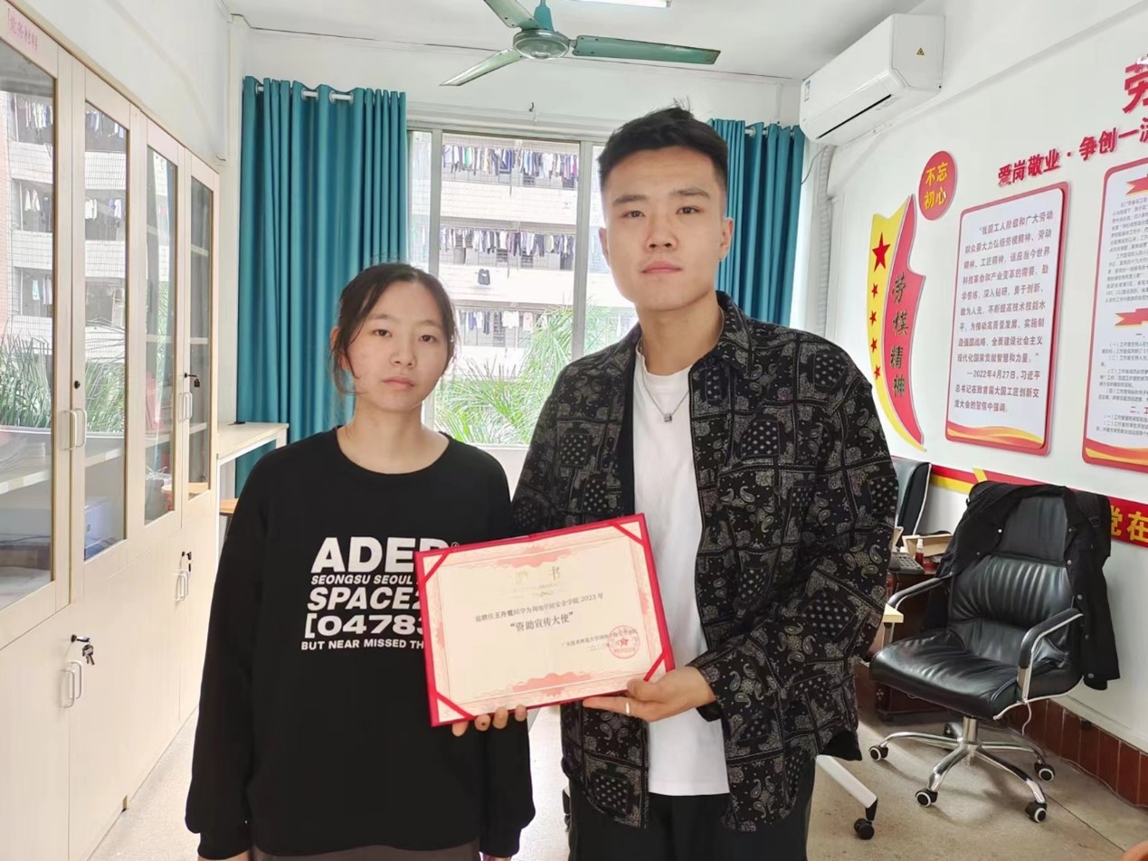在“资助宣传大使”聘任仪式上,辅导员姜云鹏为王丹霓同学颁发“资助宣传大使”聘书,面向网安学子普及国家资助政策、对浇筑资助育人的坚实基座给予厚望,发挥资助宣传大使的重要角色作用。