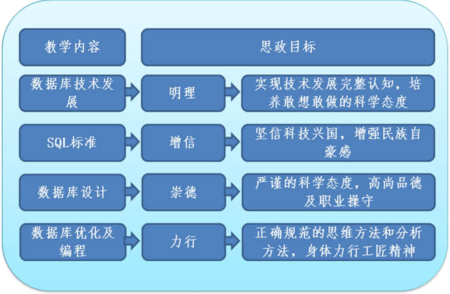 围绕 SQL 国际标准发展和我国数据库标准的建立情况,增强爱国情怀,理解工匠精神;通过对数据库的设计及开发,培养协作观念以及正确规范的思维方法和分析方法;通过对数据库的编程及优化,增强实事求是、严谨治学的科学态度以及高尚品德和职业操守。