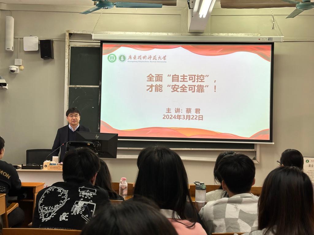 公司经理蔡君以《全面“自主可控”,才能“安全可靠”》为题,面向23网安创实班讲授了一堂生动有趣的思政课。他对同学们提出了几点要求:一是要坚定理想信念,从自身做起,规范网络行为,履行社会责任,增强法治意识,强化安全意识;二是鼓励同学们刻苦钻研,苦练本领,积极参加各类学科竞赛,不负时代,不负韶华,做国家网络安全的守护者。做到全面“自主可控”,才能实现“安全可靠”。